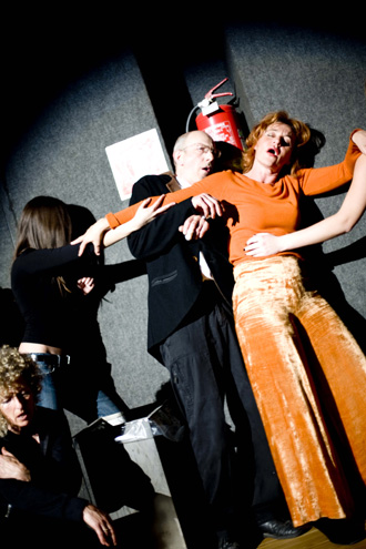 Appena tutto è silenzio, all’improvviso, uno sbattere d’ali: un attore si introduce di corsa al buio lungo la parete e, raggiunto il suo loculo, vi si annida come un pipistrello, voltando la schiena agli spettatori. Segue un altro pipistrello, poi altri due, poi a grappoli... Si formano agglomerati casuali di insettivori lungo i corridoi della sala e sotto il palco. E ora occupano tutto lo spazio dal fondo dell’entrata fino al proscenio… Quando sono sotto faro si sbattono per lo spavento della luce improvvisa… producono gesti soggettivi, individuali |