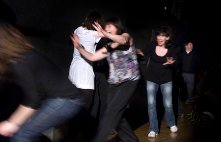 Nel frattempo, lungo i corridoi laterali, si formano file di persone vive e di morti viventi. Buio e silenzio. Tutti insieme persone vive e morti viventi si introducono da corsie opposte nelle file degli spettatori come a cercare un pasto umano