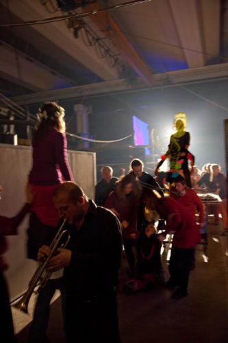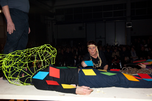 Dedalo (un attore) e Icaro (un burattino) prendono la via di fuga. Da terra si levano verso il cielo…