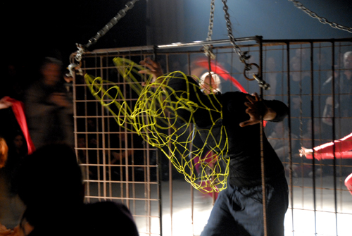 Urla, sbraita come un forsennato. Si dimena follemente. Perde bava e sbatte catene contro la prigionia della sua gabbia… Tra queste grida e fragori disumani la gabbia viene innalzata il più possibile verso il soffitto…