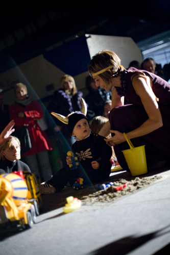 Decine di carriole che vanno e vengono… Il camioncino si allontana. La ruspa compie gli ultimi movimenti e poi esce di scena.