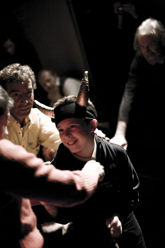 Urla e muggiti spaventosi. Luci si alzano sulla figura del Minotauro in catene trascinato a fatica dalle guardie del palazzo. Le sue braccia sono legate a un palo che fa leva contro la nuca e contro le spalle…