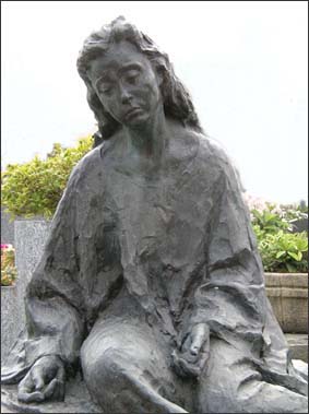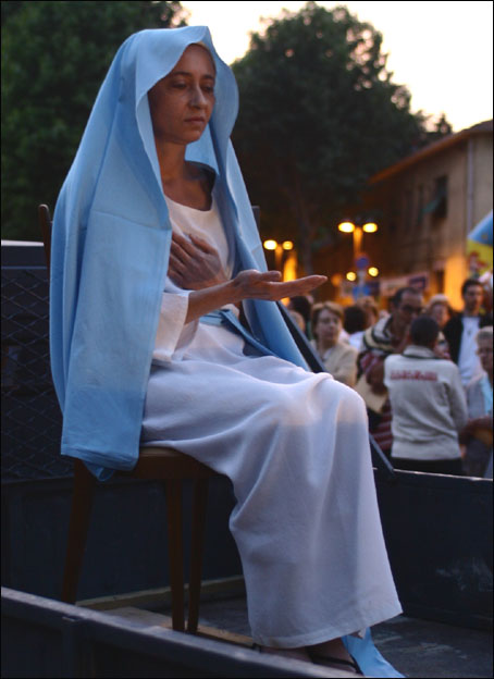 Su un vecchio motocarro, seduta, si vede la Madonna. Ad ogni sosta elargisce grazie ai passanti...