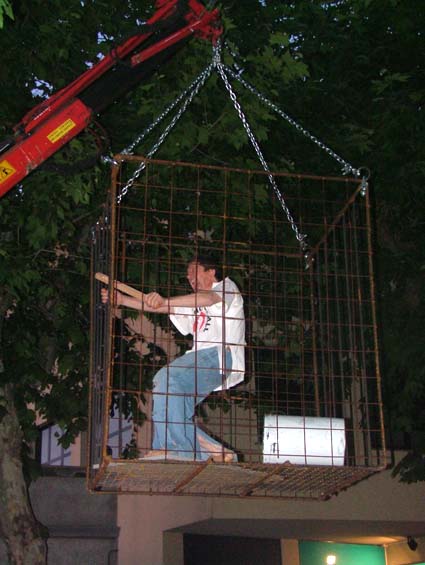 Un secondo camion gru trasposta un’altra gabbia dove è rinchiusa una flautista.